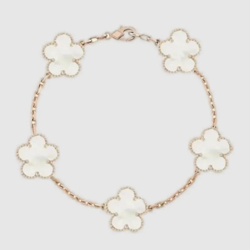 Elevate your style with this luxurious four-leaf clover charm bracelet, crafted with fine jewelry details and featuring elegant mother-of-pearl accents. Perfectly blending modern sophistication with timeless design, this bracelet is a statement piece for any occasion.